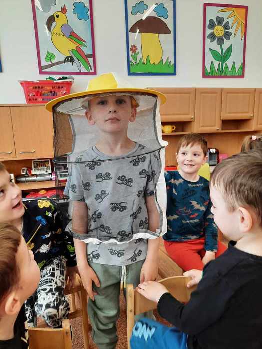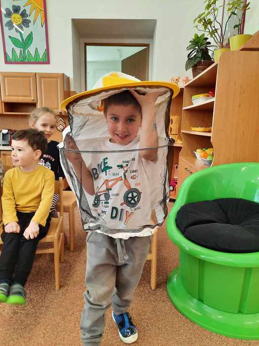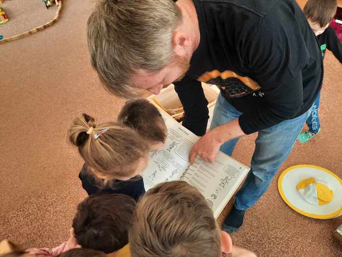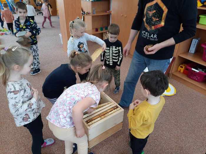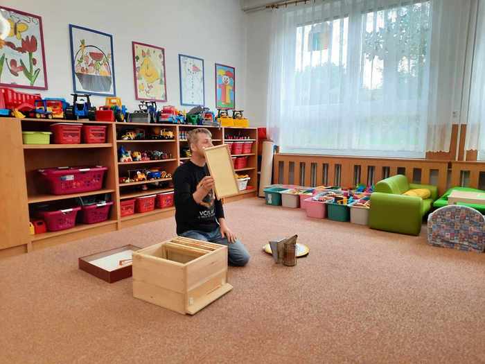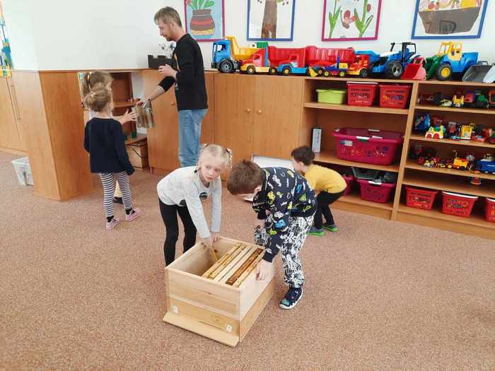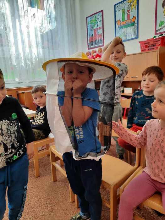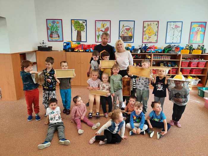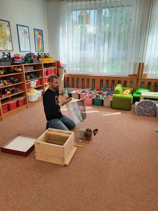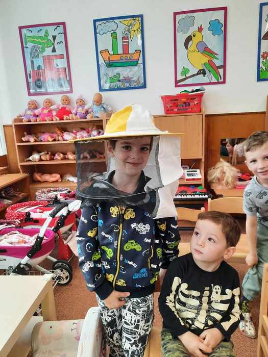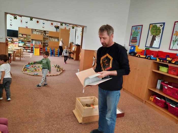 Ve čtvrtek 18.4. 2024 děti pozorovaly ve třídě pana Komoně, jak umí krásně vyprávět o včelkách a jaké přinesl dětem předměty, které včelky potřebují k tomu, aby vznikl med. Pan Komoň dětem přinesl i úl, med a medové perníčky. Dětem půjčil do MŠ knihu o včelkách, aby si ji mohly prohlížet a číst. Přednáška o včelkách byla moc hezká a zajímavá. Děkujeme.